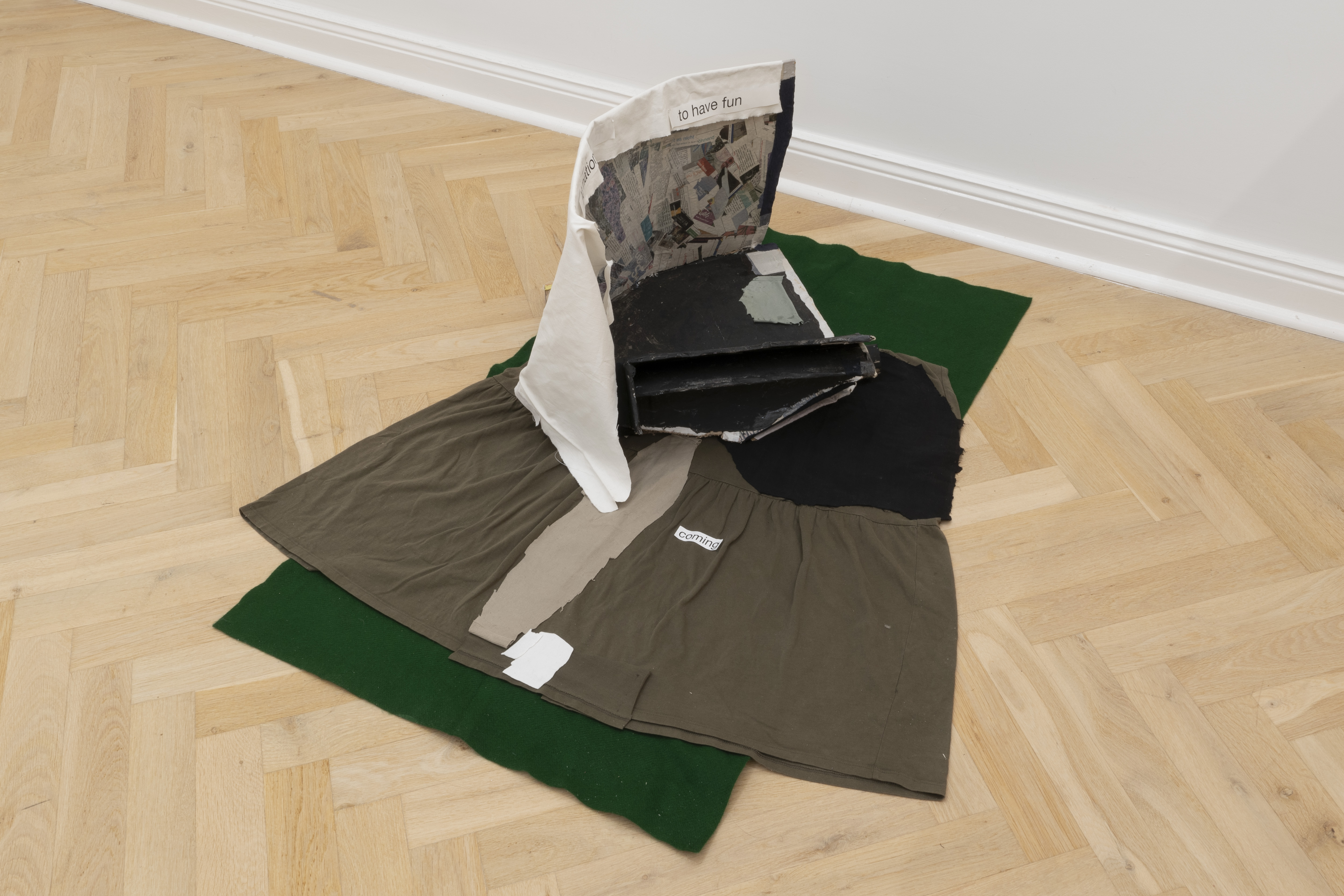 Cardboard, fabric, dress, inkjet print, glue, oil, newspaper